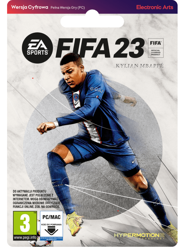 Regulamin gry EA SPORTS™ FIFA 23 *Obowiazuja warunki i ograniczenia. Wiecej informacji na stronie https://www.ea.com/games/fifa/fifa-23/game-offer-and-disclaimers. ©2022 Electronic Arts Inc. EA, EA SPORTS i logo EA SPORTS sa znakami towarowymi Electronic Arts Inc. Oficjalny licencjonowany produkt FIFA. © Nazwa FIFA i logo oficjalnego licencjonowanego produktu FIFA sa chronione prawem autorskim i (lub) stanowia znaki towarowe FIFA. Wszystkie prawa zastrzezone. Produkcja: Electronic Arts Inc. na mocy uzyskanej licencji. Do gry wymagane sa polaczenie z Internetem, Konto EA, akceptacja Umowy uzytkownika EA (terms.ea.com/pl) oraz instalacja Aplikacji Origin (origin.com/download) lub EA app (ea.com/ea-app). Obowiazuja zasady Ochrony danych osobowych i plikуw cookie EA (privacy.ea.com/pl). Wyrazasz zgode na przekazywanie danych osobowych zebranych za posrednictwem uslug EA do Stanуw Zjednoczonych, jak wyjasniono to szczegуlowo w zasadach Ochrony danych osobowych i plikуw cookie. Dostep do zawartosci oprogramowania jest ograniczony do jednego Konta EA i nie mozna przekazac go innej osobie po dokonaniu zakupu. Dostep do funkcji sieciowych moze wymagac ukonczonych 16 lat (wymagany wiek moze byc rуzny, wiecej informacji na stronie o.ea.com/ea/child-access-pl). EA moze sukcesywnie dostarczac okreslona bezplatna zawartosc lub aktualizacje. Obowiazkowe aktualizacje moga byc pobierane automatycznie, wiazac sie z oplatami za polaczenie szerokopasmowe oraz wymagac dodatkowego miejsca na dysku badz dokonania dodatkowego zakupu w celu uzyskania dostepu. Produkt gromadzi dane na potrzeby wyswietlania reklam w grze. EA moze zaprzestac udostepniania funkcji sieciowych po uplywie 30 dni od zamieszczenia stosownej informacji na stronie ea.com/pl-pl/service-updates. FIFA Points nie sa dostepne w Belgii.